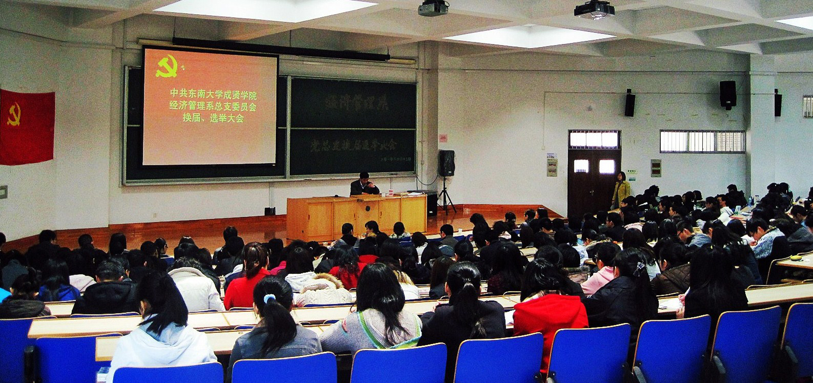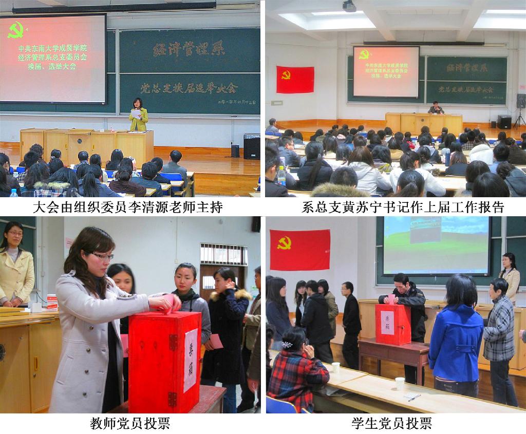 按照东南大学党委关于基层党组织进行换届选举的工作要求,4月13日中午,经济管理系党员大会暨党总支换届选举大会在文昌院112隆重举行。学院董梅芳副院长、组织人事部李秀琴老师出席了本次大会。全系310名正式党员、预备党员参加了大会。大会由系党总支组织委员、学办副主任李清源老师主持。