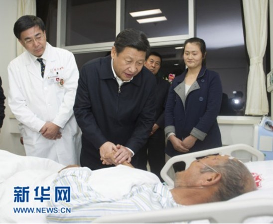 11月24日,中共中央总书记、国家主席、中央军委主席习近平来到山东青岛,考察黄岛经济开发区黄潍输油管线泄漏引发爆燃事故抢险工作。这是习近平在青岛大学附属医院黄岛分院看望慰问伤员。