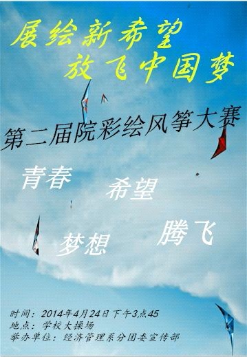 经济管理系分团委宣传部将于本月24号(周四)下午3点45在学校大操场主办第二届院彩绘风筝大赛,“展绘新希望,放飞中国梦”!到时候,大家不见不散、拭目以待青春与活力的绽放和放飞!