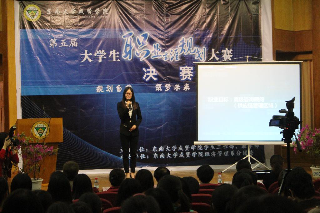 5月7日下午5:40,第五届大学生职业生涯规划大赛决赛在真知馆报告大厅圆满落幕。本次大赛由东南大学成贤学院学生工作部和教学部联合主办,由东南大学成贤学院经济管理系分团委承办。莅临本场比赛的嘉宾及评委老师有高新区国税局李声银局长、江苏省高校就业指导中心职业规划大赛连续七年特邀评委潘业喜老师、东南大学成贤学院副院长董梅芳老师、教学部部长冀京红老师、学工部部长唐小平老师、学工部副部长、分团委书记杨阳老师、招生就业办公室副主任陶建国老师。出席本场比赛的还有各系分团委书记和辅导员老师以及各系各专业的同学们。