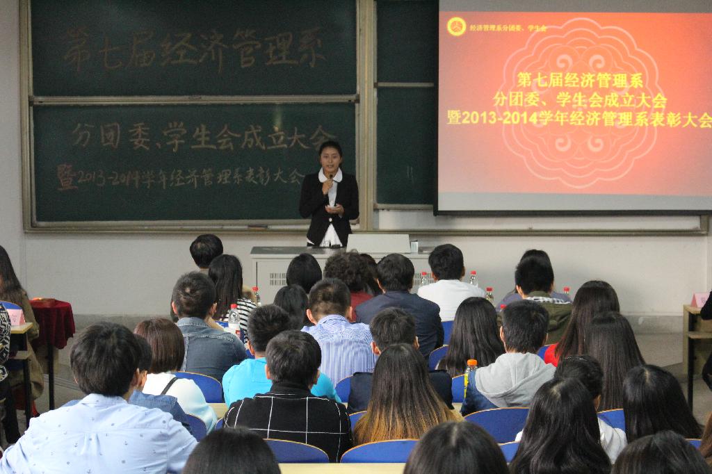 2014年10月15日下午4时,由经济管理系分团委组织部承办的第七届经济管理系分团委、学生会成立大会暨2013-2014学年经济管理系表彰大会在华馆204圆满落幕。出席本次大会的嘉宾有经济管理系党总支书记黄苏宁老师、经济管理系综合办主任李清源老师、经济管理系分团委书记程希羲老师及各专业辅导员等。