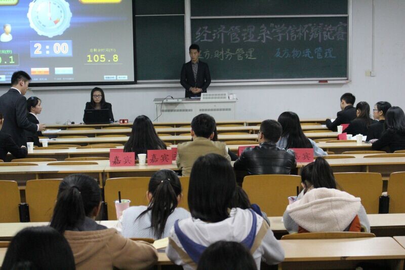 2014年11月06日晚6时,由我系学生会学习实践部举办的“学信杯”辩论赛在文昌403成功开展。本次比赛由财务管理对战物流管理。出席本次比赛的嘉宾有经管系学生会秘书长潘亦、经管系学生会副主席张鑫等。此次比赛的评委是东南大学成贤学院资深辩手、2014南京市高校辩论赛阵容主力卢超颖,东南大学成贤学院校辩论队主力人员韩也逸,经管系辩论队主力成员匡舒璠。