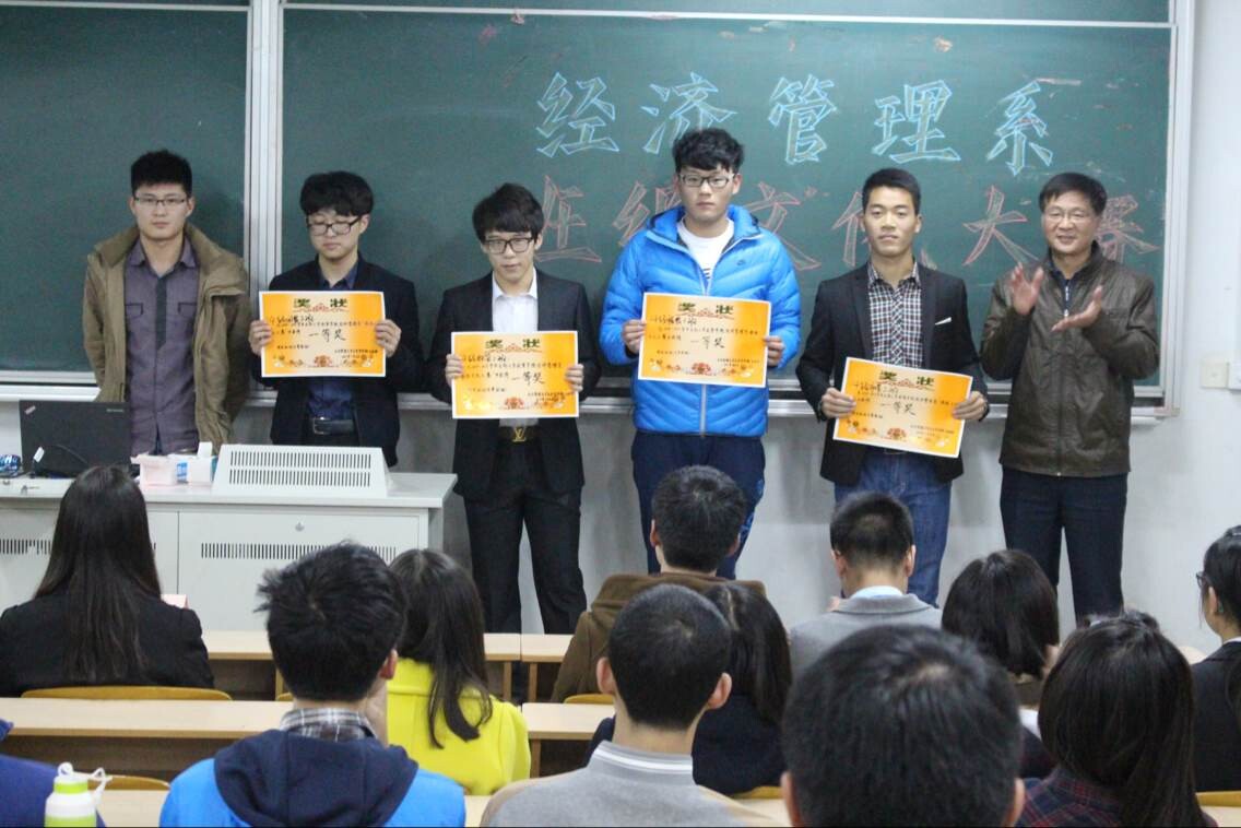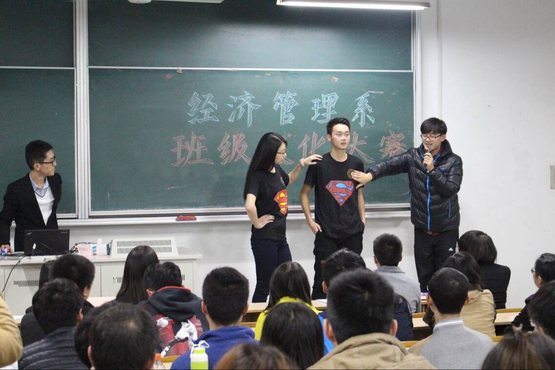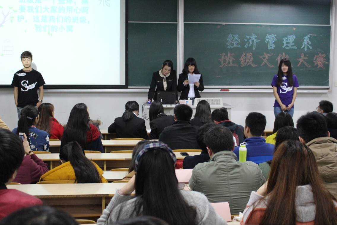 2014年11月26日晚6:30,由经济管理系学生会生活部和宣传部承办的经济管理系班级文化大赛于文昌院303顺利开展。出席本场比赛的嘉宾有经济管理系14级物流、电商辅导员吴京浦老师,经济管理系14级国贸、税收、市营辅导员姚明辉老师,经济管理系分团委副书记张明波,经济管理系学生会主席邢栋,经济管理系学生会秘书长潘亦。