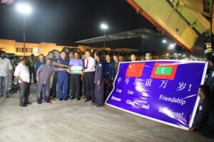 8日凌晨,中国空军两架“伊尔-76”运输机共运载40吨瓶装水抵达马累国际机场。驻马尔代夫大使王福康和机组人员向马方应急工作组主席、国防部长纳兹姆转交了援助物资,马内政部长乌玛尔、经济发展部长萨伊德、总统府部长沙里夫等出席捐赠仪式。