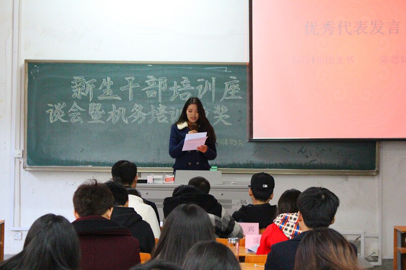 首先进行的是机务培训的颁奖仪式,由嘉宾们向机务培训活动中的获奖者颁发奖状和礼品,以肯定他们在机务培训中取得的优异成绩。接着,主持人带领大家一起欣赏了ppt,ps和绘声绘影三项课程的优秀获奖作品,灵动绚丽的图片与视频带给了大家美妙的视觉享受。随后,全场的新生干部就“关于新生干部培训有何想法与意见”和“你如何处理工作与学习与生活的关系”这两个话题展开了热烈的讨论,班级及部门代表们分别讲述了自己对学习生活及工作三者关系的看法,大部分人主张应该把学习放在第一位,在工作中不断提高自身对活动的策划、组织、控制、总结的能力,在学习和工作中享受生活。最后,学生会副主席张鑫做总结发言,他以自身经历向大家讲述了他在大学生活中总结得出的经验,鼓励同学们积极参加各项活动,协调处理好工作学习和生活的关系,努力的充实自己。