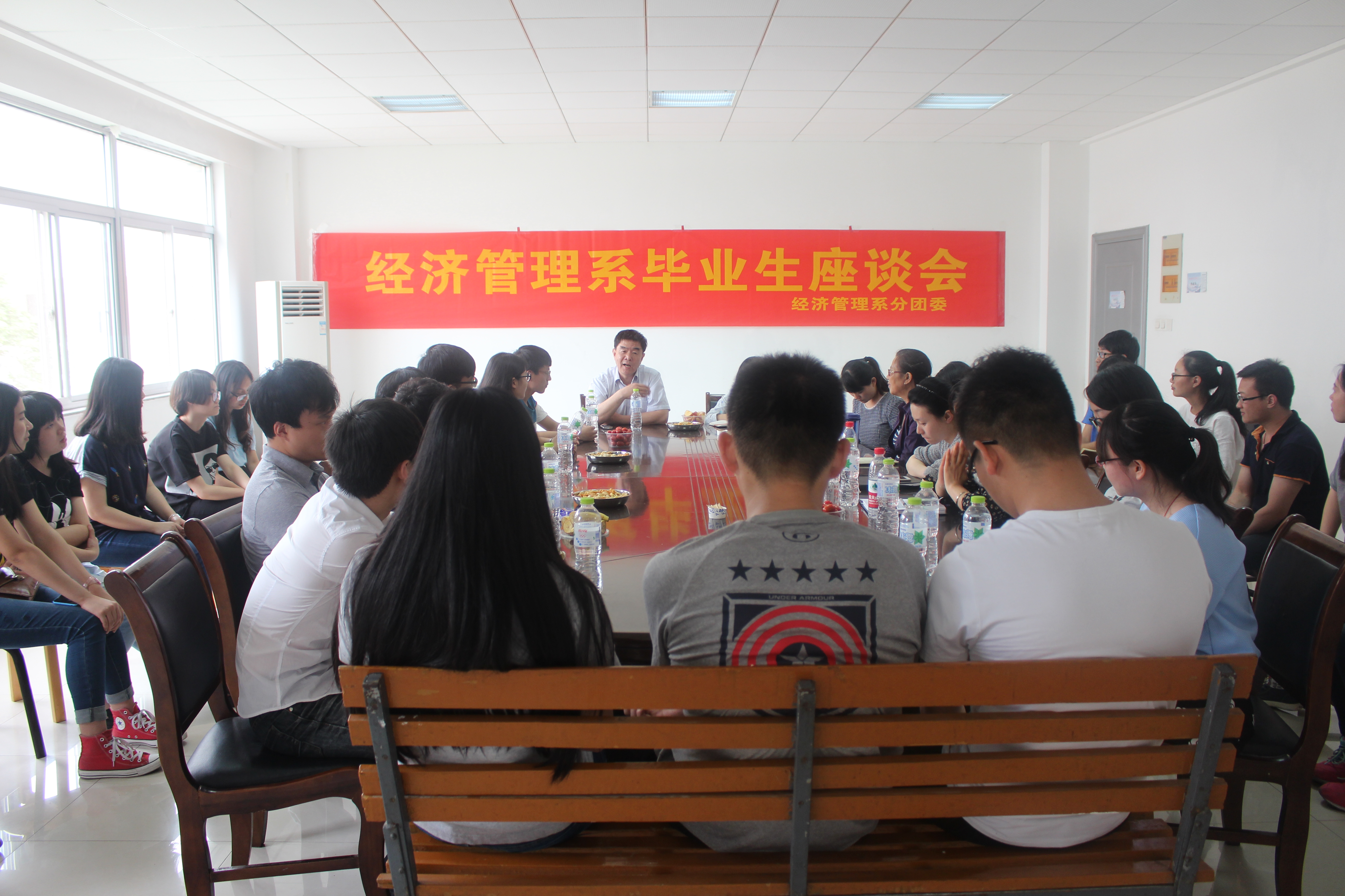 5月26日下午,由经济管理系分团委举办的2015届毕业生座谈会在成贤经济管理系会议室举行。我系党总支书记黄苏宁老师、综合办主任李清源老师、分团委书记程希羲老师以及各专业辅导员老师出席本次座谈会。来自我系各专业的12名毕业生代表参加了座谈会。